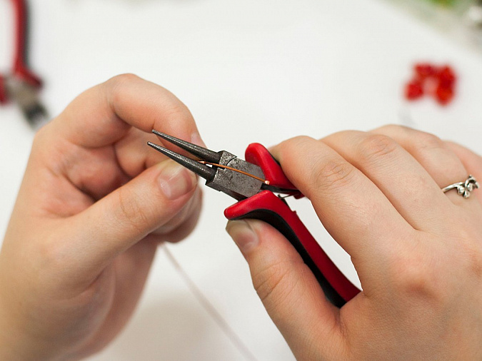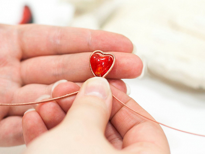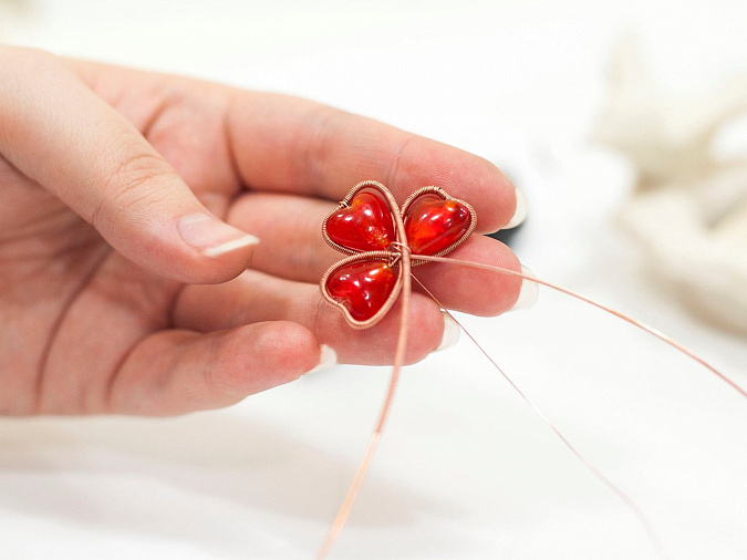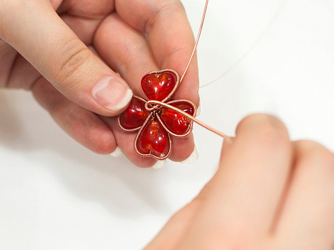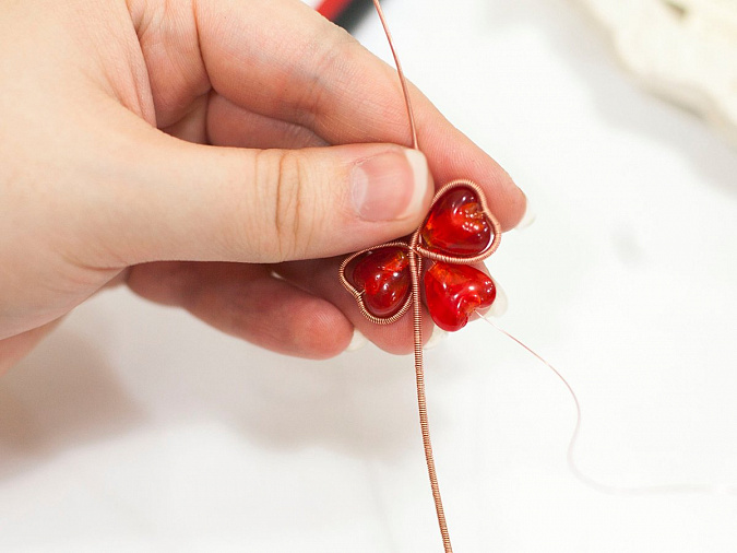 15. Таким же образом оборачиваем проволоку вокруг второго сердечка, так же фиксируя бусину в уголке из проволоки.