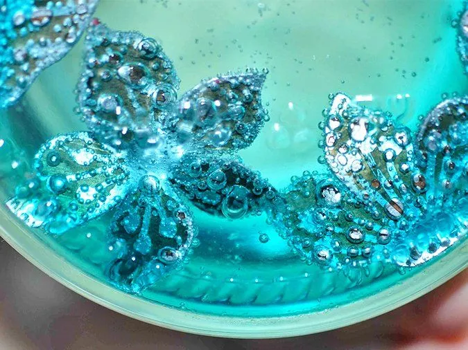 3. Жидкость для травления: в стеклянной баночке смешиваю перекись, лимонную кислоту и соль, заготовки кладу рисунком вниз. Самое начало — первые пузырьки