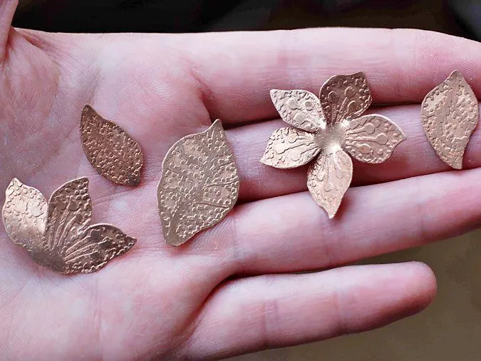 1. Из медного листа вырезаю ножницами заготовки: листики-цветочки; изгибы подпиливаю гравировальником (можно напильником или лобзиком пилить по контуру, но это занятие для терпеливых)
