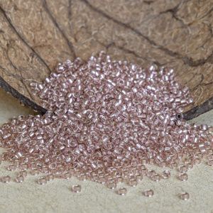5. Для второго и следующих рядов мы берем мелкий бисер. Нанизываем 1 бисеринку и продеваем леску сразу в 2 бисеринки первого ряда, методом обратный стежок.