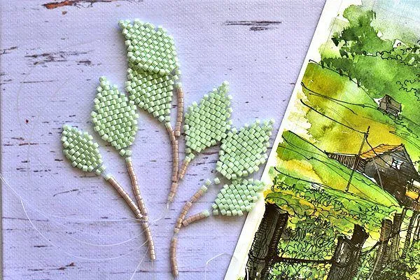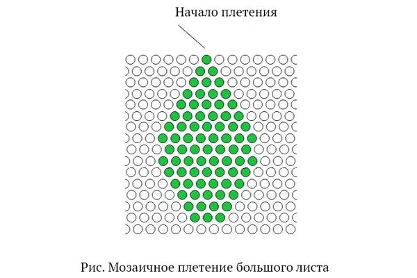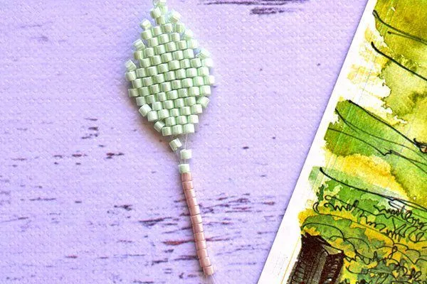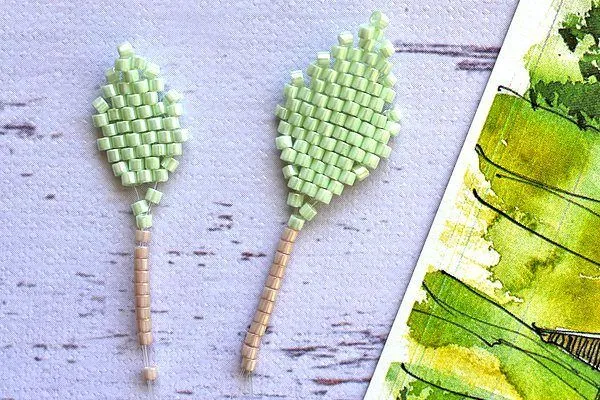 1. Приступим к заготовкам листочков. Листочки плетем в технике мозаичного плетения из светло-зеленого бисера.