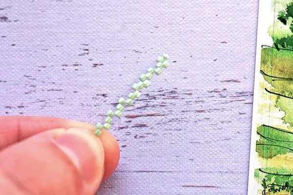 13. Берем лист, на каждый конец лески нанизываем по 1 светло-зеленой бисеринке.