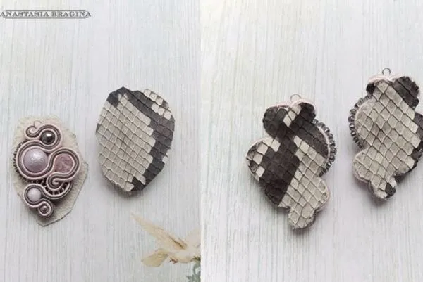 17. Приклейте кусочки кожи к сережкам, дайте клею подсохнуть и обрежьте кожу по контуру сережек. Пришейте кожу к сутажным элементам зацепляя иголкой лишь самый край сутажа.