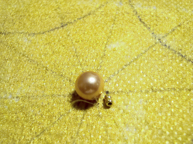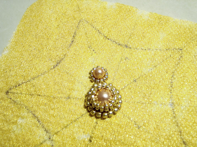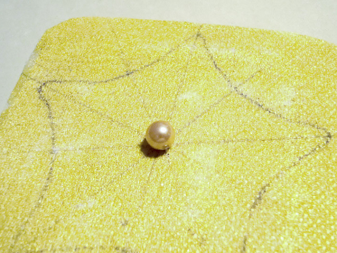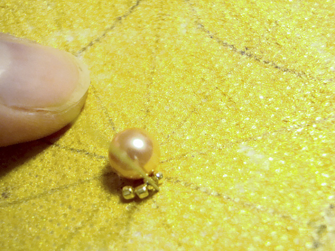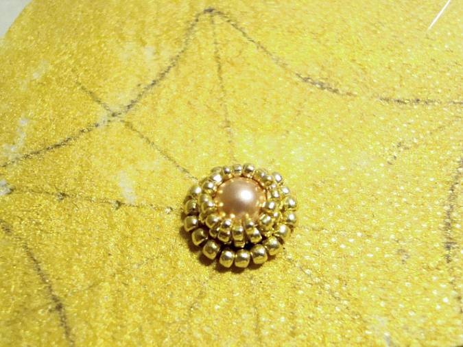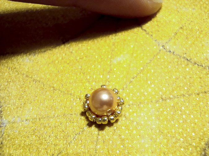 • 4. Оплетаем жемчужину по принципу кабошона. Для начала пришиваем вокруг жемчужины ряд 15/0 золотых бисерин.