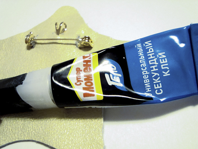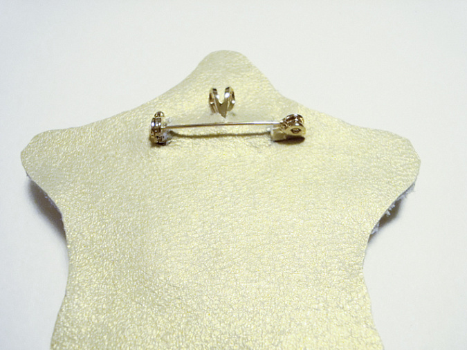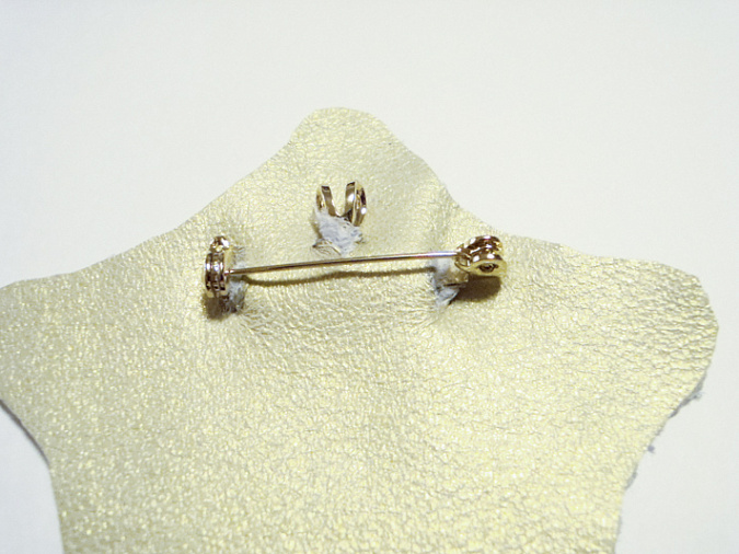 • 33. торчащие кусочки изнанки кожи потом уберем иголкой или зубочисткой внутрь, совсем лишнее – срежем. Буквально парой капелек секундного клея приклеиваем основу броши к коже.