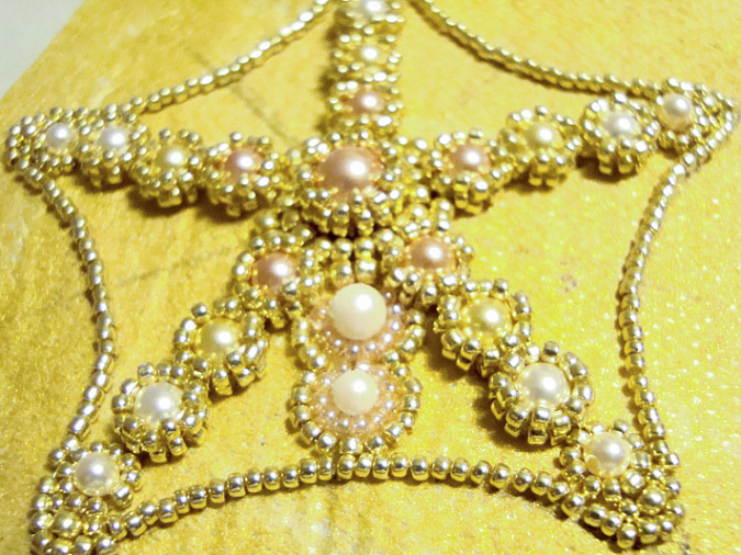 • 21. В промежутках между лучами пришиваем по несколько крупных золотых бисерин.