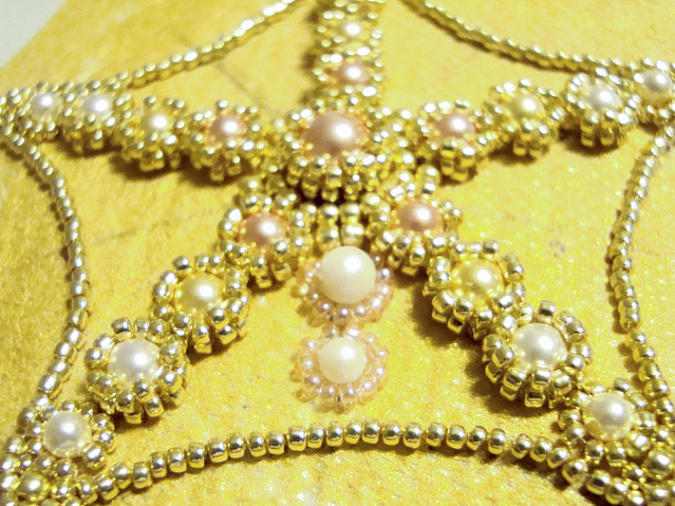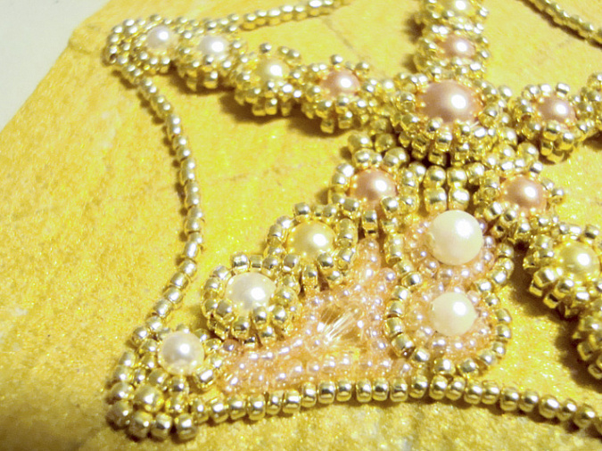 • 17. Продолжаем лучи, пришиваем и оплетаем золотые бусины-жемчужины за розовыми. А за ними кремовые 4 мм. Их тоже оплетаем.