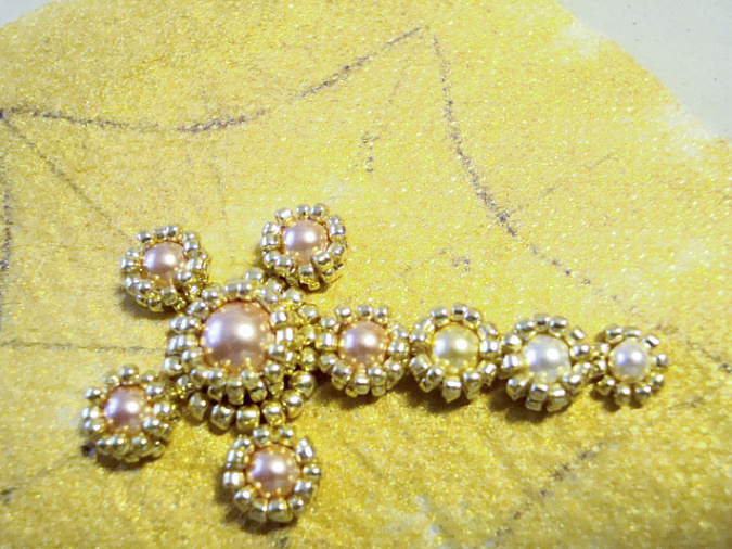 • 22. Далее по линиям между лучами пришиваем матовые жемчужины, 4 мм ближе к центру, 3 мм – за ними. Их мы тоже не будем оплетать, обошьем розовым бисером.