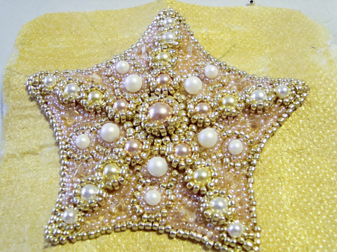 • 20. Теперь вышиваем контур звезды мелким золотым бисером. В уголках лучей пришиваем крупные золотые бисерины, заполняя пустоты.