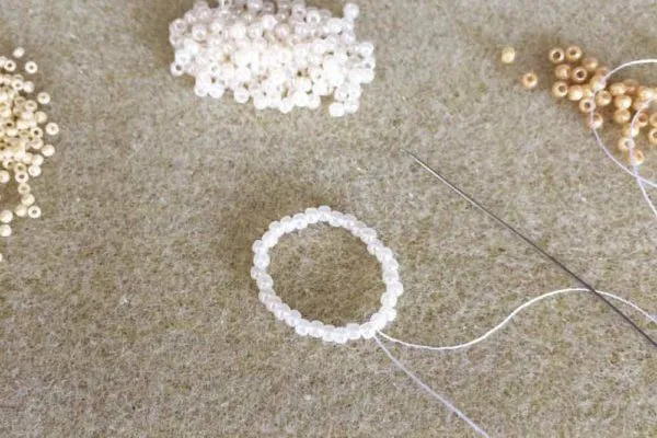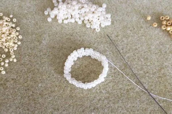 1. Нанизываем на нить 32 бисерины 11/0 и замыкаем круг. Закрепляем нить.