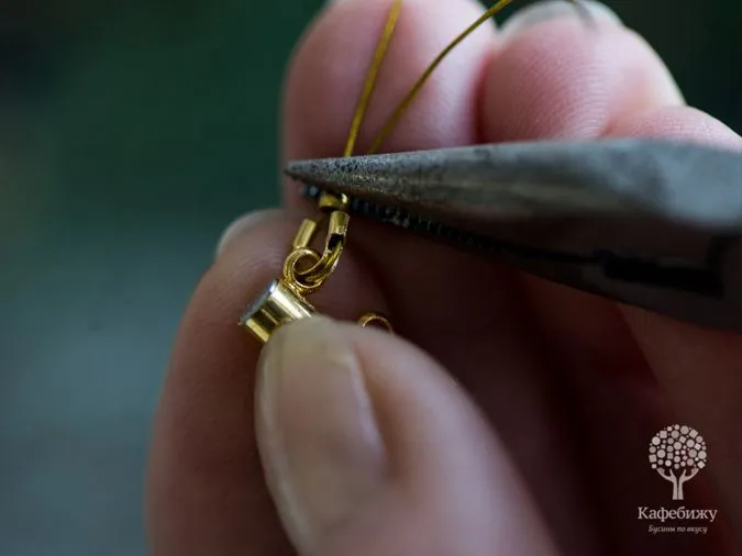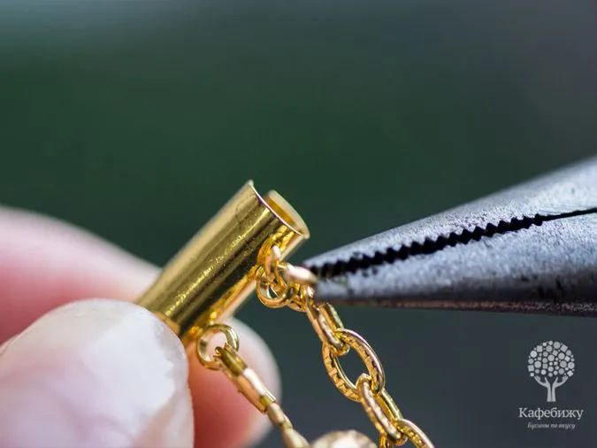 • 13. С помощью соединительных колечек прикрепим подвески к звеньям цепочки, бусинки закрепляем аналогично, но предварительно формируем петельку из пина