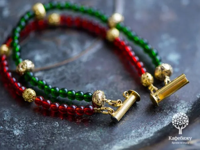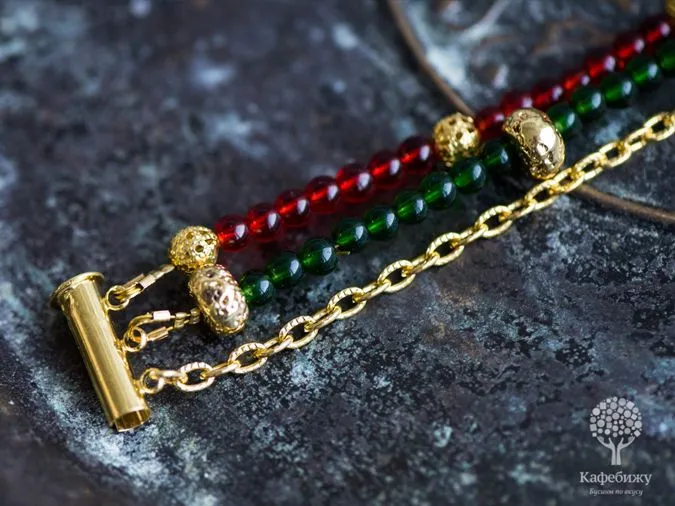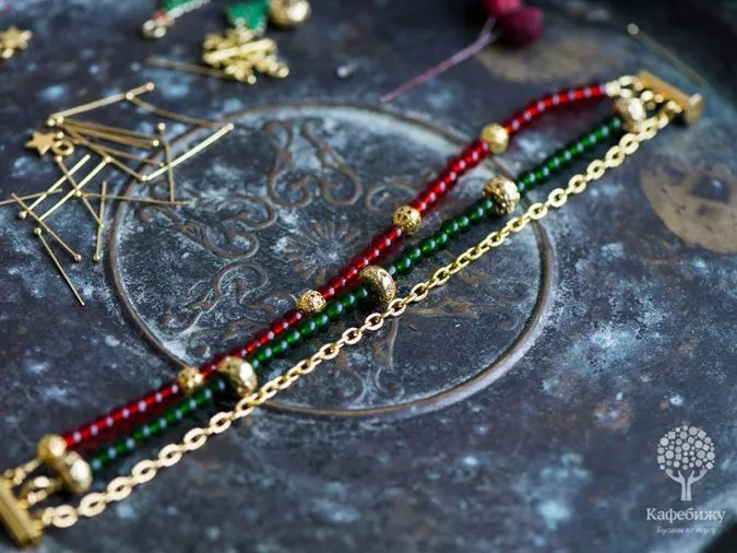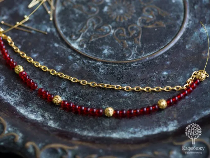 • 6. В таком же порядке, как на фото, нанизываем красные бусинки (7 красных + 1 золотая), периодически сверяем с длиной цепочки