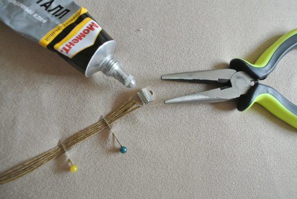 9. Обрезаем излишки нитей, оставив 1 см. Смазываем концы нитей клеем, помещаем внутрь зажима-концевика и защемляем плоскогубцами.