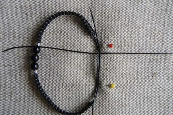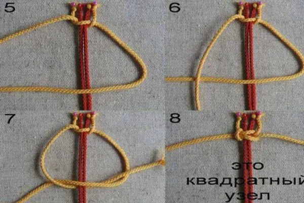 • 10. Закругляем браслет, как показано на фото, и плетем застежку из четырех квадратных узлов. Основой здесь служат обе нити браслета, рабочей нитью – отдельная нить 20 см.