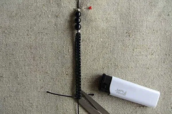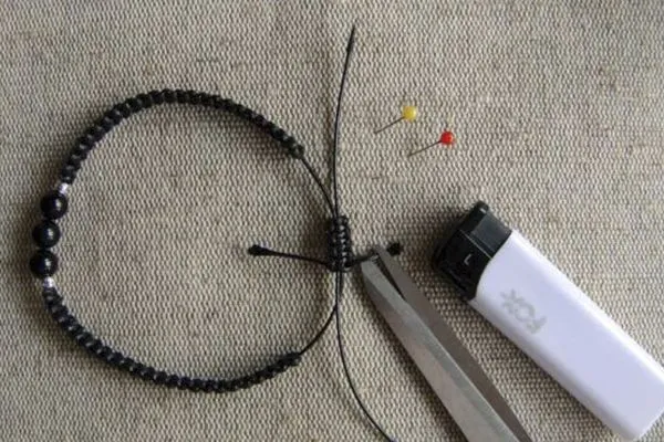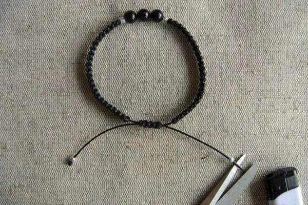• 13. Оформляем концы браслета: надеваем металлические бусины-шарики, обрезаем излишки нитей, оставив 5-6 см, подпаливаем концы.