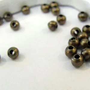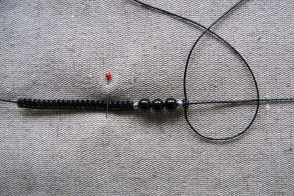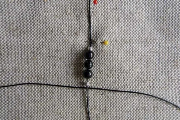 • 3. Берем основу браслета – нить 40 см, надеваем на нее 3 бусины из агата по центру и 2 металлические бусины с орнаментом по бокам. Помещаем все бусины на середину нити.