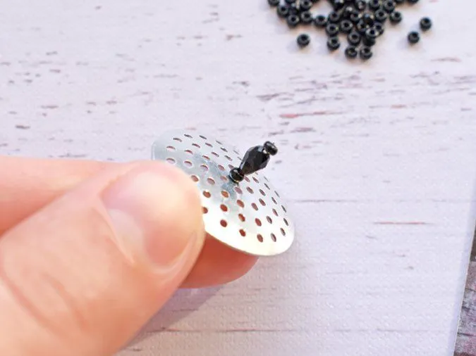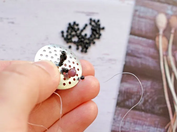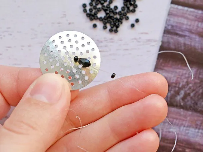 • 1. Серединку делаем на сеточке. Нанизываем черную бисерину, бусинку-каплю и черную бисеринку