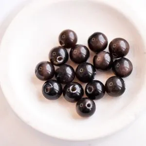 • 4. Второй и третий ряд: 2 бисерины черного цвета, бусинка 6 мм и бисерина черного цвета, пропускаем бисеринку и проходим леской через бусинку, 2 бисерины и отверстие сеточки
