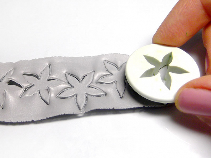 • 28. Нужно сделать три серебряных цветочка. Тоненько раскатываем пластику серебряного цвета. Вырежьте три звездочки диаметром 2см. Вырезаем ножом или специальной высечкой.