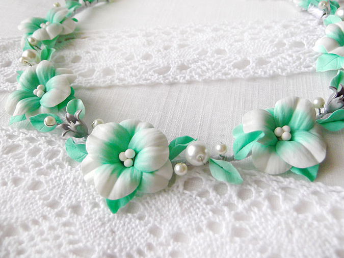 Воздушное колье с бело-мятными цветами