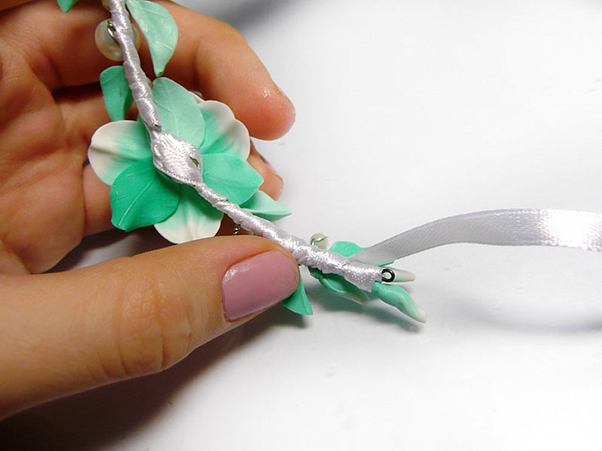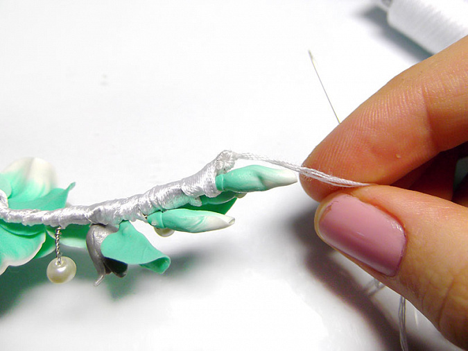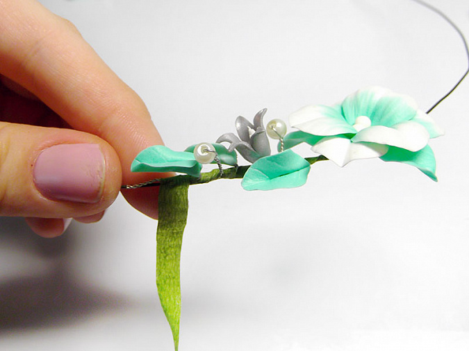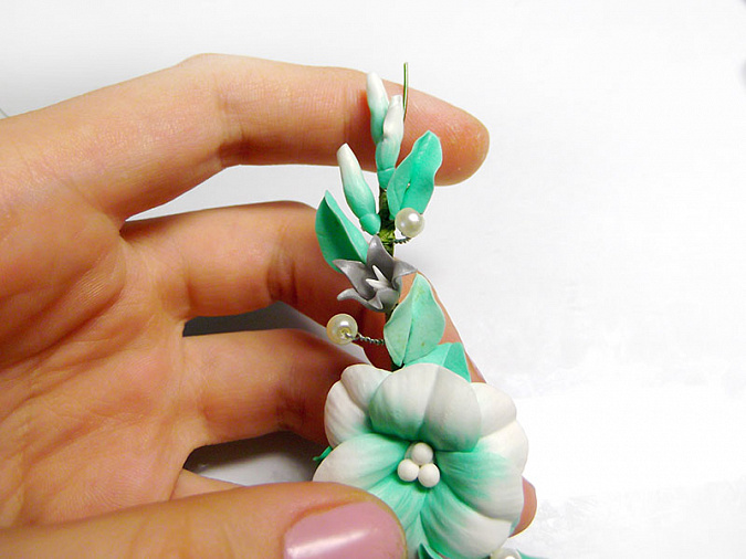 • 41. Примотайте к проволоке 3 листа, пару бусин и серебряный цветочек на небольшом расстоянии друг от друга. Затем закрепите на проволоке еще 2 бело-мятных цветка и между ними остальные элементы.