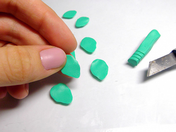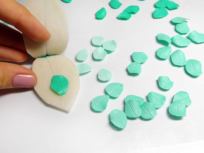 • 34. Скатайте каждый кусочек мятной пластики в виде трости и разделите на примерно одинаковые части. Из каждой части вылепите заостренный листик длиной 1,5см.