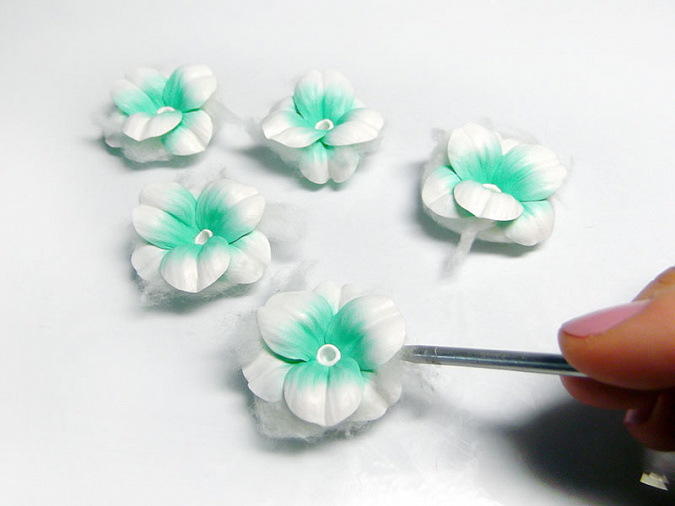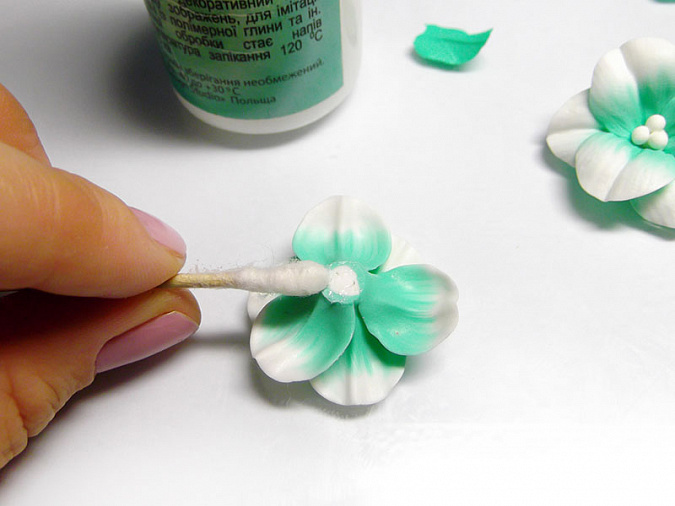 • 37. Бело-мятные цветы запеките при температуре, указанной на упаковке глины, 7-10 минут. Подождите, пока они остынут. На нижнюю сторону цветов нанесите жидкую глину тонким слоем.