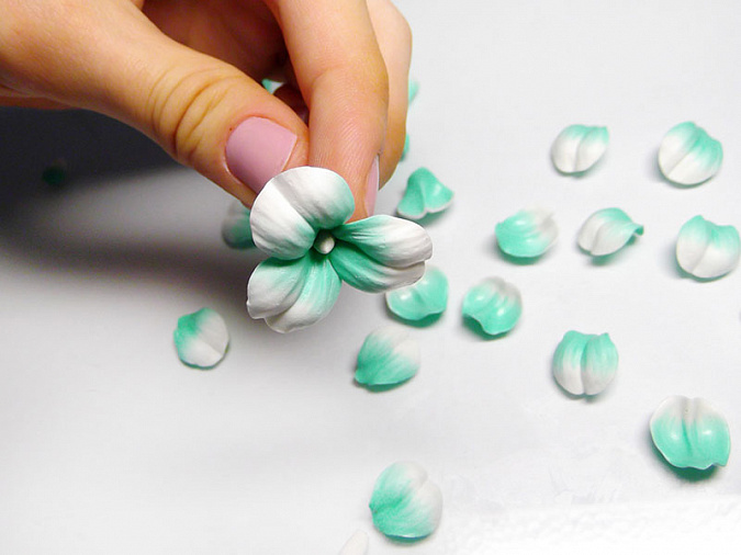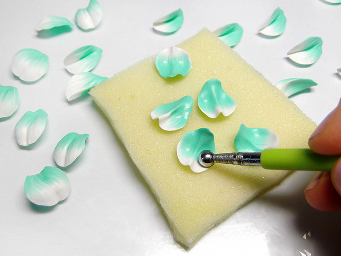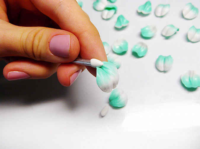 • 12. Каждый кусочек сначала расплюсните пальцами, а затем придайте им форму лепестков одинакового размера, немного сужающиеся к нижней (мятной) стороне.