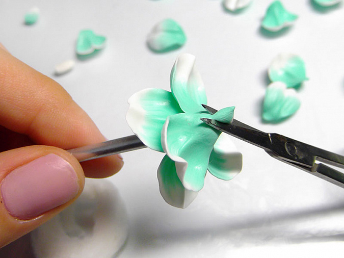 • 19. Осторожно придерживайте цветочек и срежьте ножницами лишнюю, выступающую снизу глину.