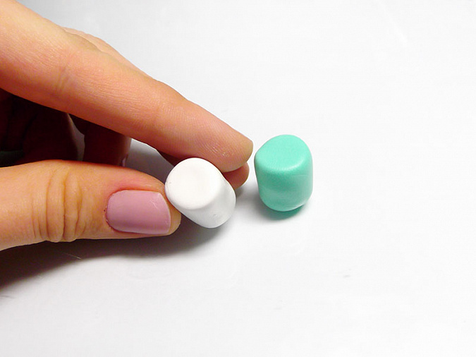 • 1. Зеленую глину (небольшую часть) смешайте с большой частью белой глины. Из мятной глины и белой сформируйте по одному бочонку высотой примерно 3см каждый и толщиной около 1,5 см.