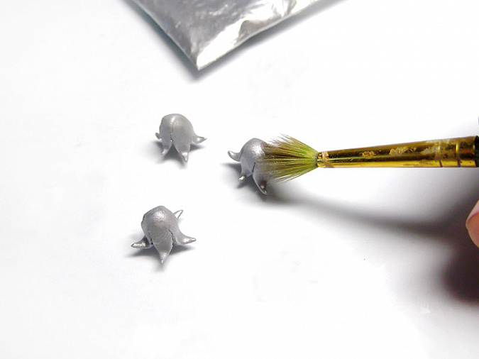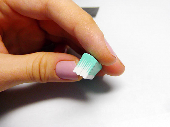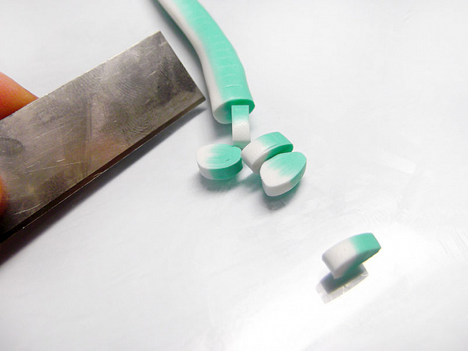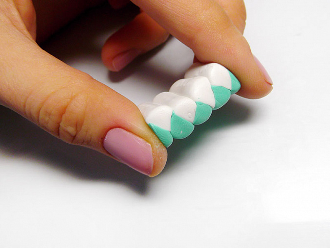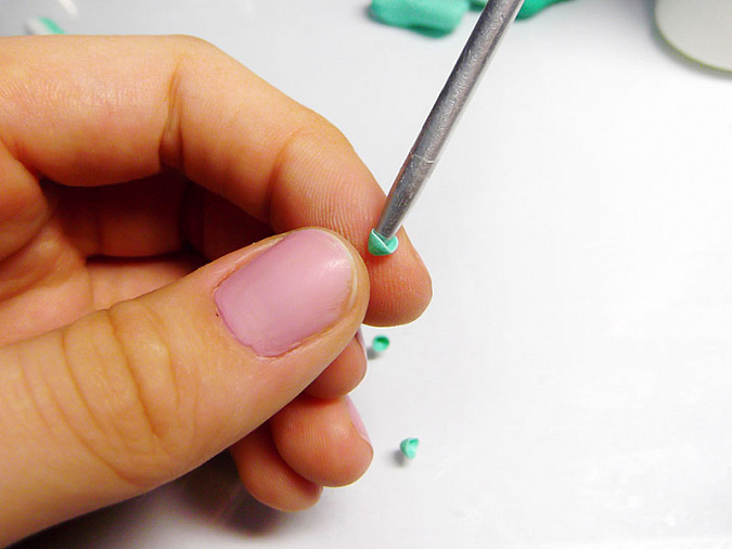 • 26. Скатайте 6 шариков диаметром 5мм из мятной глины. В шариках сделайте стеком сквозную дырочку.
