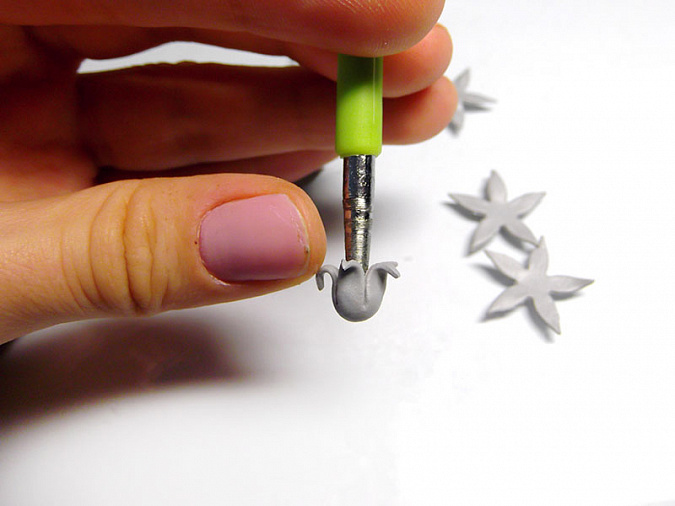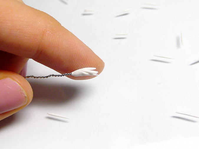 • 15. Конец заостренного стека облепите белой глиной и прикрепите к нему лепесток.
