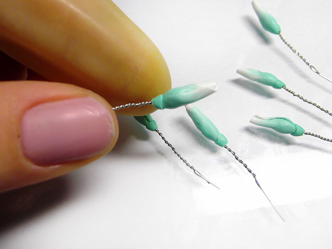 • 31. Скатайте из белой глины тоненькие колбаски длиной 1см. По несколько шутк прилепите к концам трех проволочных отрезов.