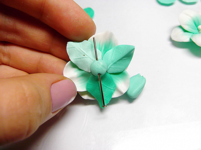 • 38. Прилепите к цветку три листа разного оттенка. Сверху на место стыка листьев прилепите круглый кусочек мятной глины, а в него вставьте отрезок той проволок, из которой вы будете делать основу колье.
