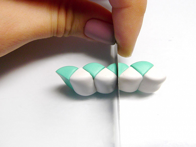 • 3. Сложите все сегменты так, как показано на фотографии. Должна получиться продолговатая заготовка с зубчатым рисунком. Разрежьте ее ровно посередине.
