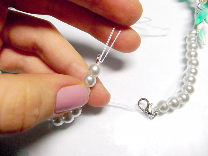 • 48. Вденьте концы нитки в иглу и нанизайте на нее примерно 12-15 белых бусин диаметром 7мм. К концу нитки крепко привяжите колечко и обрежьте нить. Узелок желательно смазать клеем. Аналогично прикрепите бусины ко второму концу колье, а к ним – карабин.