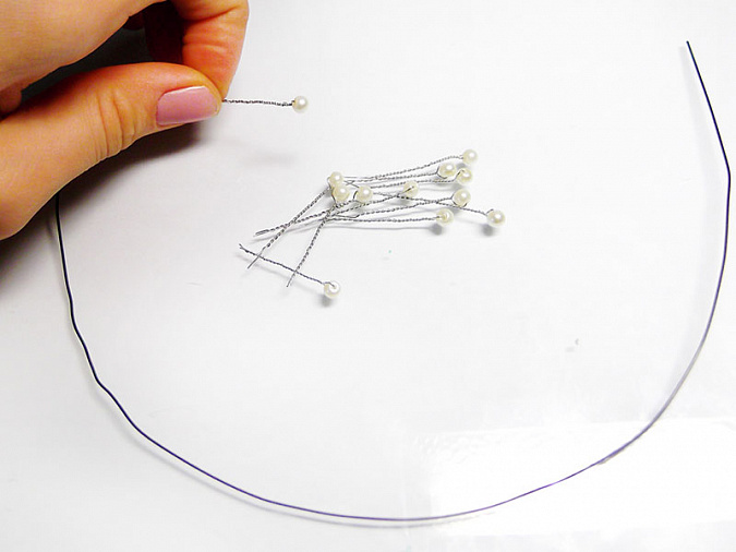 • 39. От проволоки толщиной 1-1,5см отрежьте кусок длиной 30-35см. согните его в форме полукруга. К отрезкам более тонкой серебристой проволоки прикрутите белые бусины желаемого размера.