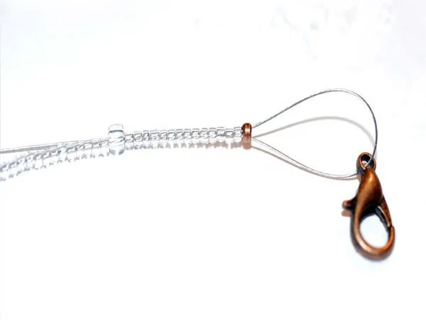 • 15. Теперь нанизываем бисер с маленькими бусинами, достигнув нужной длины нанизываю кримп, замочек и кончик тросика обратно в низку, тянем наружу после последней бусины – кончик удобней будет прятать именно в ней.